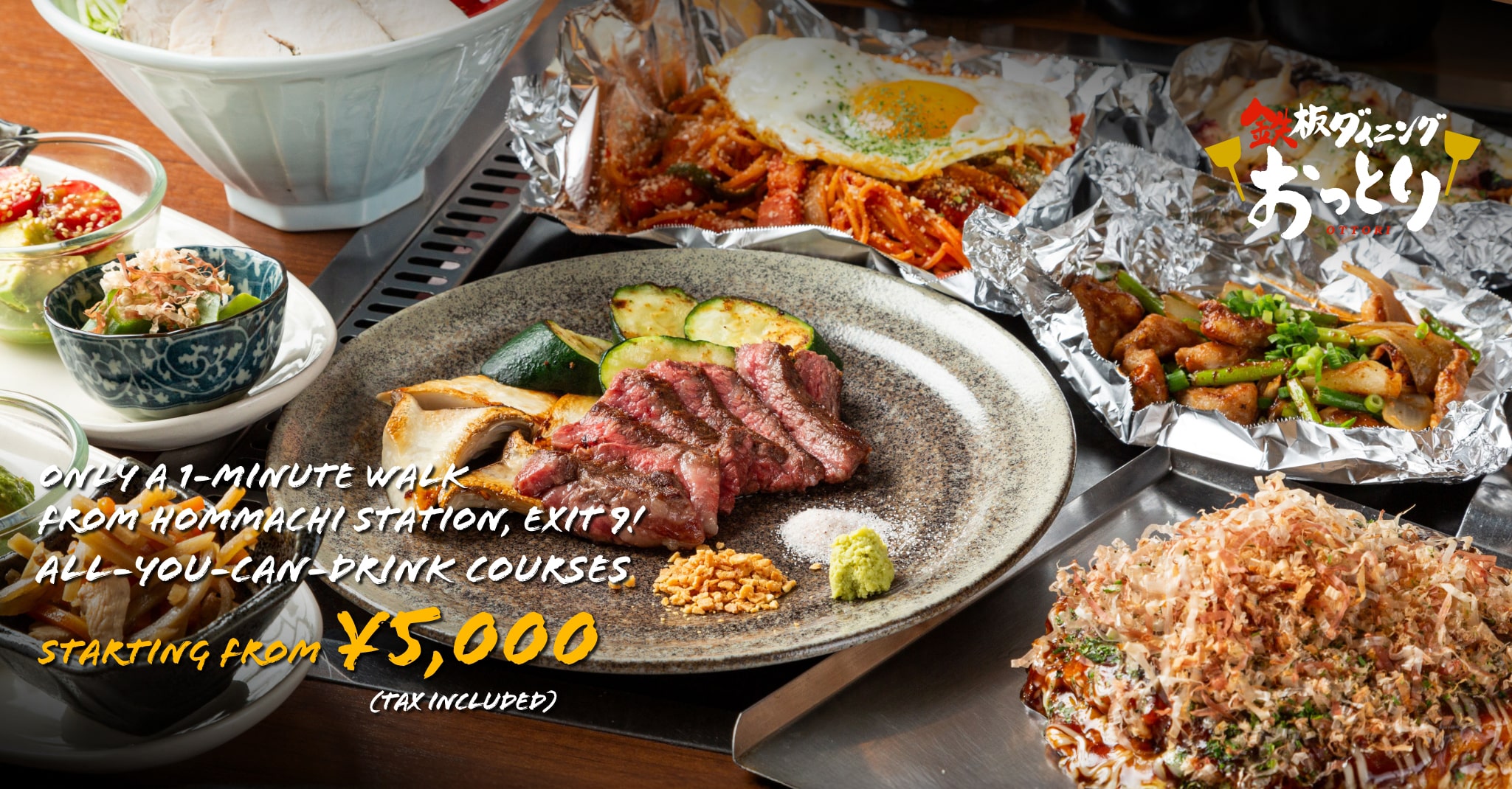 Teppan Dining Ottori Hommachi, just a 1-minute walk from Hommachi Station in Osaka, is perfect for hosting banquets. Enjoy our signature Okonomiyaki and Kuroge Wagyu steak with all-you-can-drink courses starting from ¥5,000 (tax included). Private floor rentals are available: 1st Floor for 20 people, 2nd Floor for 40 people, 3rd Floor for 25 people, accommodating up to 85 guests. Ideal not only for company parties and welcome/farewell gatherings but also for casual meals or during sightseeing in Osaka.