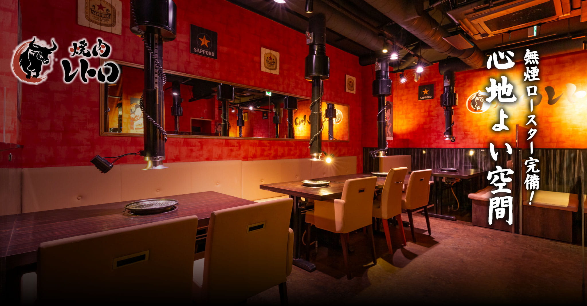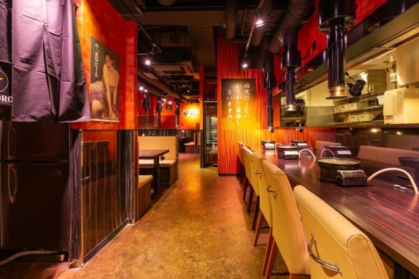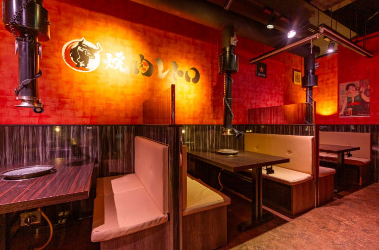 赤を基調とした店内は、どこか懐かしさを感じさせる落ち着いた空間です。各席に無煙ロースターを完備し、煙や匂いを気にせず焼肉を楽しめます。ゆったりとしたソファ席で自然と会話が生まれ、友人同士や家族でのお食事、仕事帰りの飲み会まで、さまざまなシーンで使いやすい空間です。