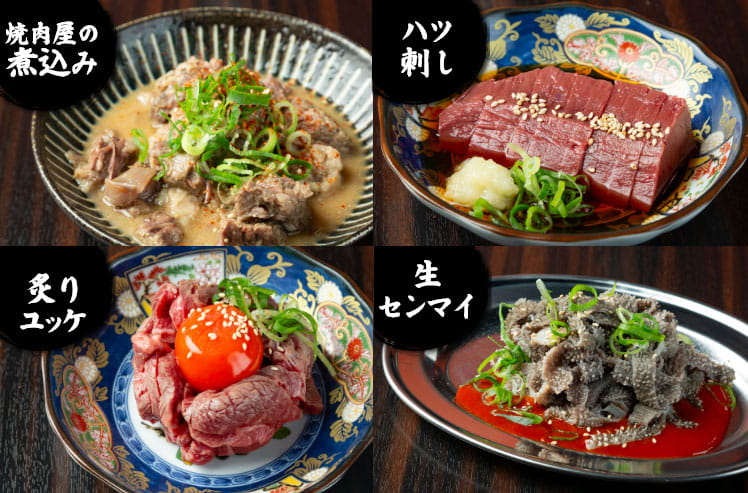 焼肉の合間に楽しめる一品料理も、自慢の品揃えです。『焼肉屋の煮込み』『ハツ刺し』『炙りユッケ』『生センマイ』など、いずれもお酒と相性の良い味わい。焼肉と一緒に、ぜひお楽しみください。