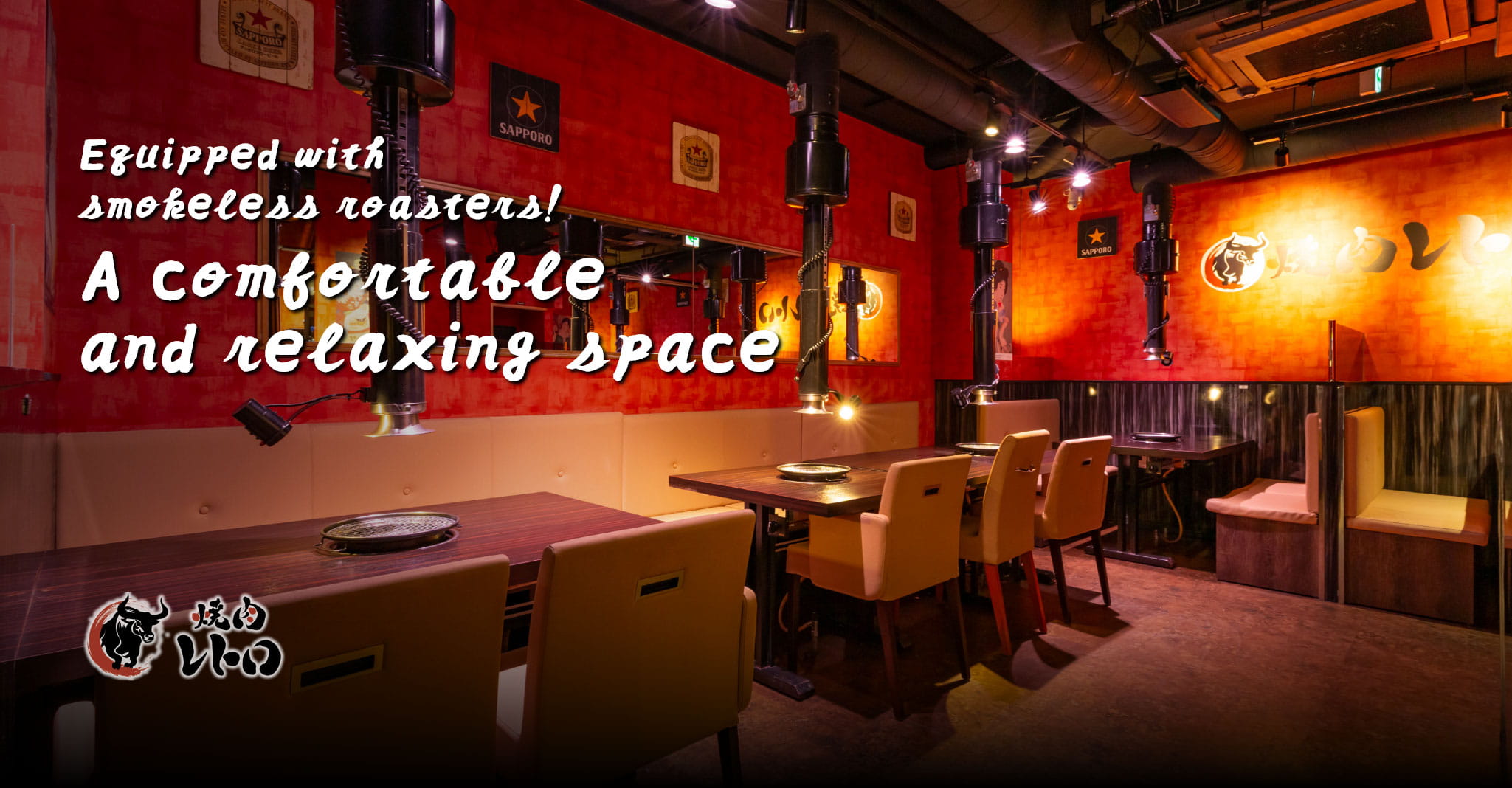 The interior, designed around a red color theme, offers a calm atmosphere with a touch of nostalgia. Each table is equipped with a smokeless roaster, allowing you to enjoy yakiniku without worrying about smoke or lingering odors. The spacious sofa seating encourages natural conversation, making it an ideal setting for meals with friends and family, as well as after-work gatherings. It’s a versatile space suitable for a variety of occasions.